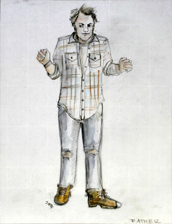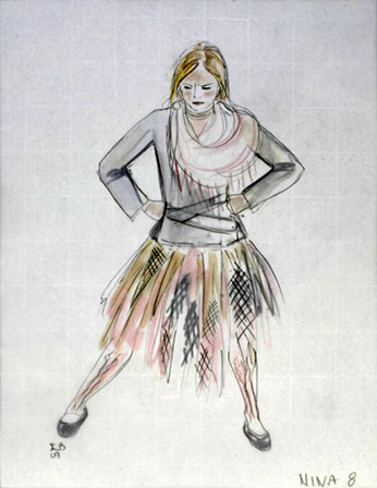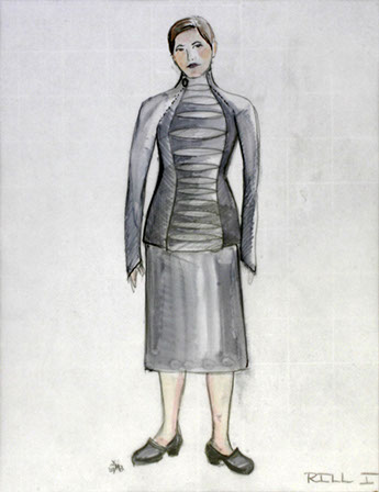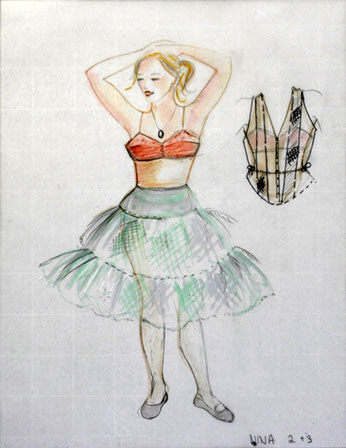 "On this unusual tiled floor we meet Nina (Maya Lawson). Blond, with a slightly nasal voice, she is jumping and dancing to fireworks dressed in one of those pseudo bohemian layered dresses with leggings underneath and worn out faded pink ballet slippers. In contrast, costume designer E.B. Brooks puts her older dark-haired sister Rill (Carey Peters) in a stiff dark gray jacket--looking like something inspired by both a military uniform and a straight jacket. She wears a pleated gray skirt and dark hose and sensible shoes. It's as if Rill, pronounced like real, never got over the Catholic school girl phase.”