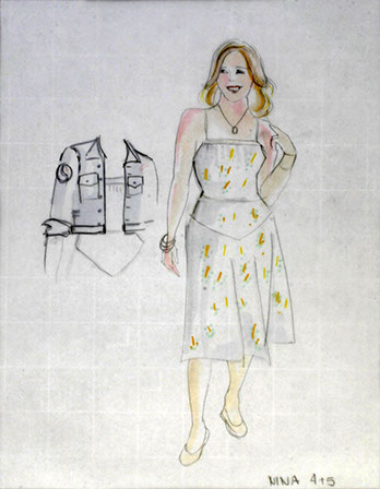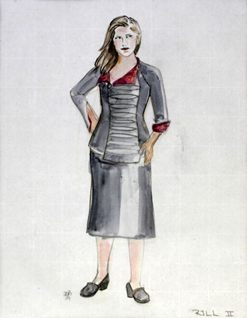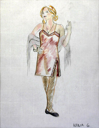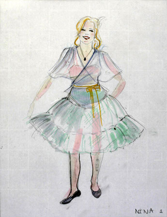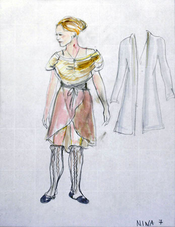 "On this unusual tiled floor we meet Nina (Maya Lawson). Blond, with a slightly nasal voice, she is jumping and dancing to fireworks dressed in one of those pseudo bohemian layered dresses with leggings underneath and worn out faded pink ballet slippers. In contrast, costume designer E.B. Brooks puts her older dark-haired sister Rill (Carey Peters) in a stiff dark gray jacket--looking like something inspired by both a military uniform and a straight jacket. She wears a pleated gray skirt and dark hose and sensible shoes. It's as if Rill, pronounced like real, never got over the Catholic school girl phase.”